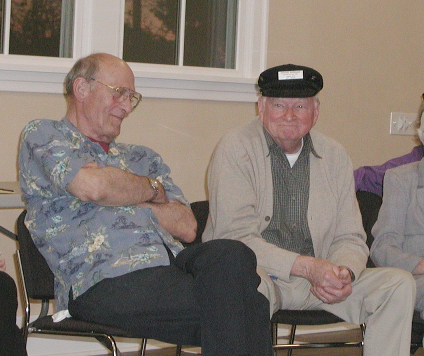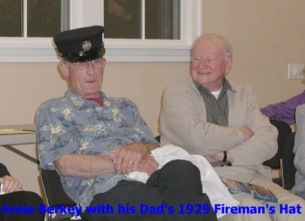 Click on a picture to enlarge it The Evening's Story about the Two hats Arnie Berkey had his dad's fireman's hat from 1929 and Verhard Diekmann was presented with a cap from Mayor Bob Neir for his involvement with the Parks Department Marina Park as an Honorary port commission or Captain of the Port of Kirkland (Marina Park) December 15 1991. Both were actiive in the Kirkland Parks expansion programs. Arnie told of the all out volunteer effort to build the first swimming pool in Kirkland and Verhard a former teacher was active in forming all the great parks we enjoy today. Thanks guys, well done.